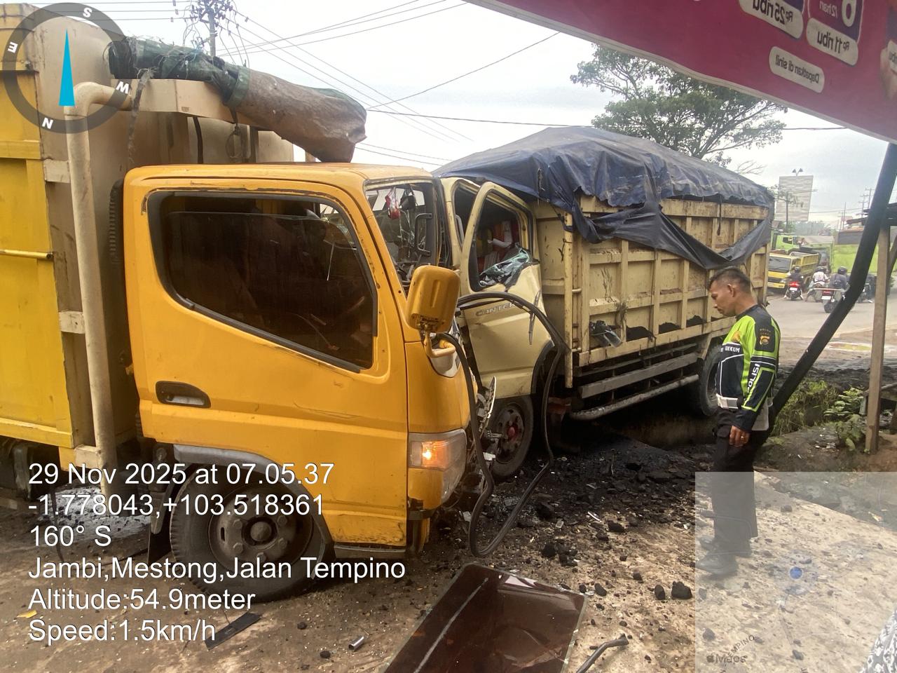 JAMBILIFE.COM- Muaro Jambi – Sebuah kecelakaan terjadi pada pukul 05.00 WIB di depan SPBU 24.366.16 Tempino, Kecamatan Mestong, Kabupaten Muaro Jambi. Mobil angkutan batubara bernomor polisi B 9108 BYW menabrak sebuah kendaraan yang diduga digunakan untuk melangsir BBM bersubsidi dan sedang parkir di bahu jalan. Tidak ada korban jiwa dalam peristiwa tersebut.