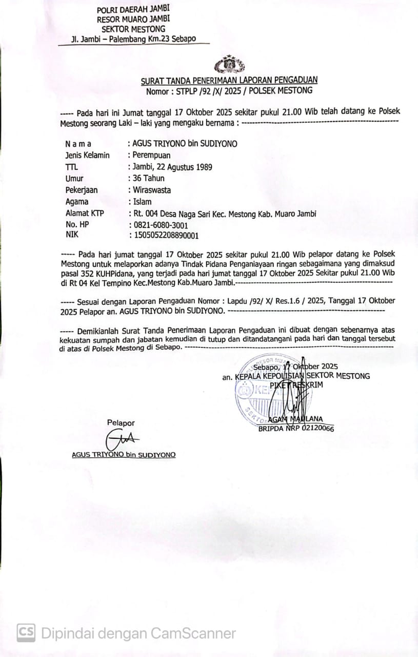 Insiden tersebut disaksikan sejumlah warga, termasuk orang tua korban. Setelah dilerai, korban melaporkan kejadian itu ke Polsek Mestong. Laporan polisi telah diterima dengan nomor STPLP/92/X/2025/Polsek Mestong, dengan dugaan pelanggaran Pasal 352 KUHP tentang Penganiayaan Ringan.