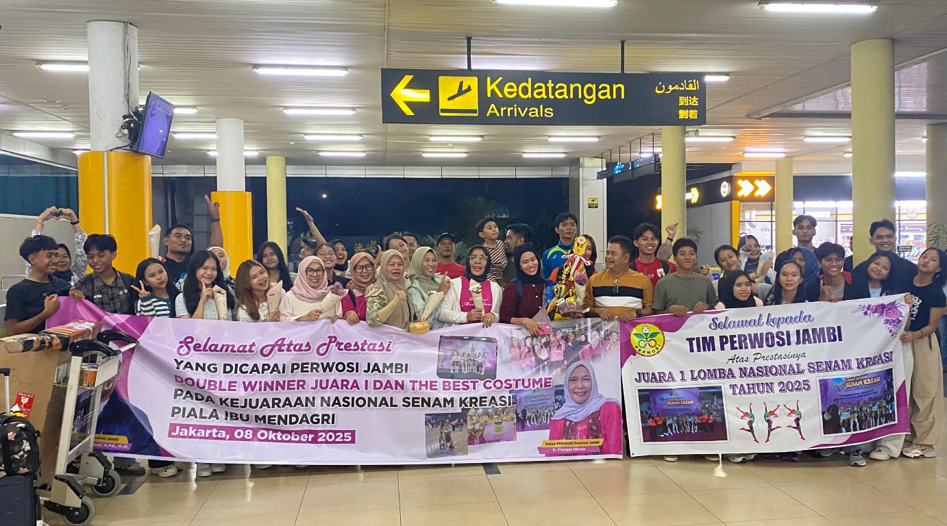 JAMBILIFE.COM – Tim Senam Perwosi Jambi, yang mengikuti Lomba Nasional Senam Kreasi 2025 Stadion Sumantri Brojonegoro Jakarta, 8 Oktober 2025, kini telah tiba di Jambi, Sabtu (11/10/2025) dengan sejarah manisnya, sebagai juara pertama.