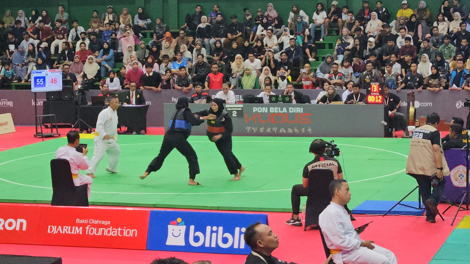 Tampil dengan percaya diri, Andhini Ayu dari babak pertama terus memimpin skor pertandingan dari lawannya Indri yang beberapa kali terjatuh ke matras akibat teknik sapuan kaki pesilat Jambi.